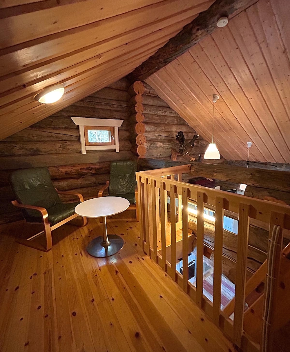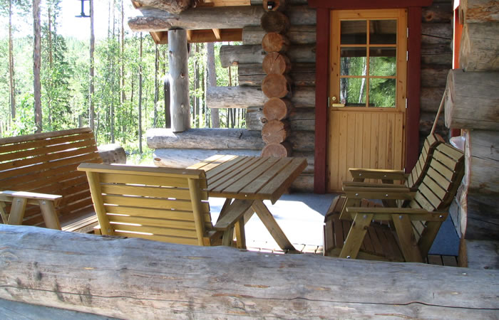 The cabin has terrace decking, a hallway, kitchen/lounge area, spacious attic bedroom, toilet and a heat storing fireplace.